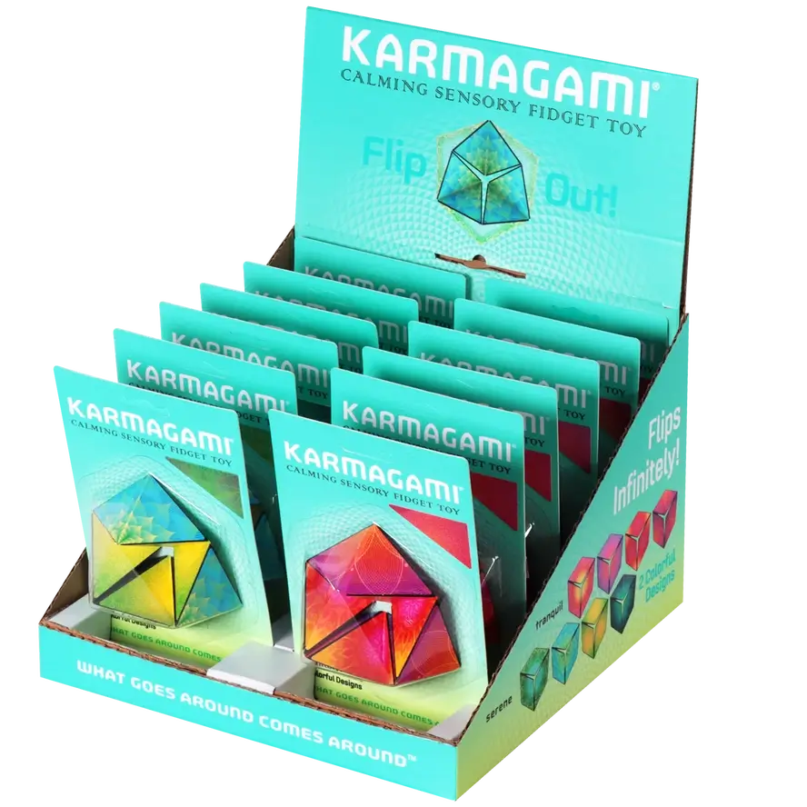 Karmagami flips infinitely into 4 colorful designs, like a kaleidoscope. This fidget toy is made of four hinged, plastic pyramids with psychedelic, tear-resistant stickers. It infinitely rotates to show you a total of 4 unique colorful designs and is super easy to use!