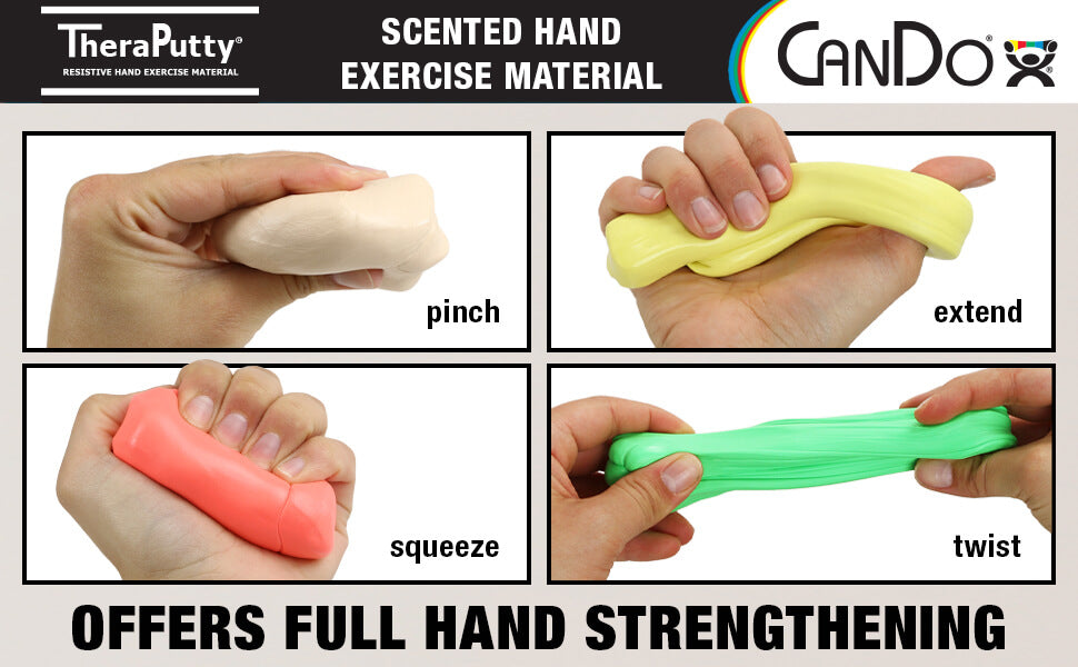 Unit price perCanDo Scented TheraPutty Exercise Putty (1 lb) is the standard in resistive hand exercise material. Each color-coded putty has a different consistency ranging from xx-soft for strengthening the weakest grasp to extra-firm for developing a stronger grip. The scented versions are a hit with younger children and help them stay present to participate in exercises.